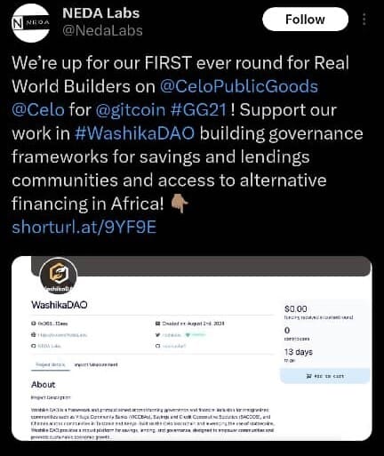 Two Tanzanian startups are participating in the Gitcoin Grand Round 21. Neda Labs with their project #WashikaDAO and ReFi Tanzania, both of which are showcasing their dedication to creating real impact within the Web3 ecosystem.