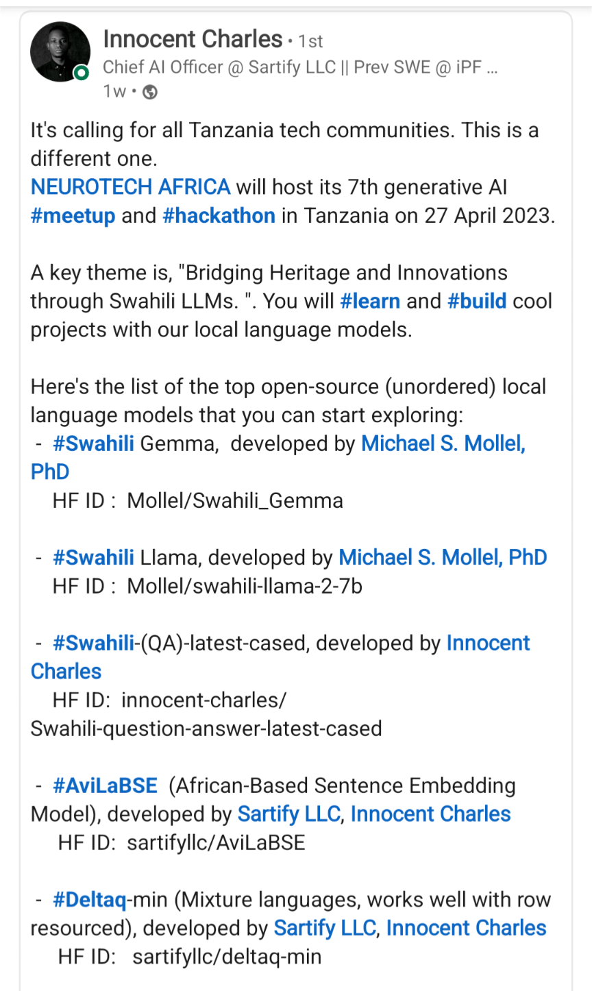 The 7th GenAI Meetup and Hackathon took a significant step towards building using swahili AI with model developed by Michael S. Mollel, PhD an alumnus of Nelson Mandela African Institute of Science and Technology and Research Engineer at University of Glasgow.
