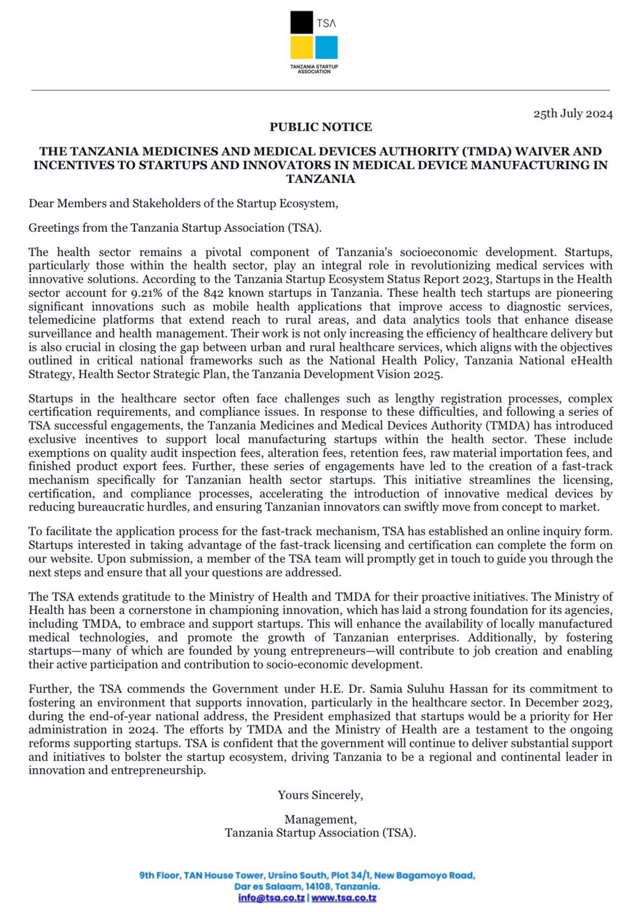 The Tanzania Startup Association (TSA) has announced a groundbreaking initiative in collaboration with the Tanzania Medicines and Medical Devices Authority (TMDA). This initiative introduces a series of exclusive incentives to support startups and innovators in medical device manufacturing in Tanzania. 🩺